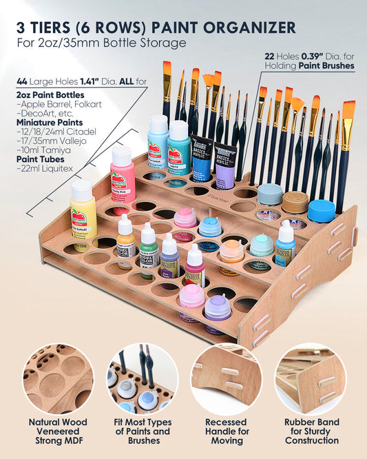 Wooden Paint Organizer & Paint Brush Holder, for 44 Bottles & 22 Brushes - Paint Holder for Acrylic Painting, Paint Rack for Miniature Paint Set, Acrylic Paint Storage, Craft Paint Organizer
